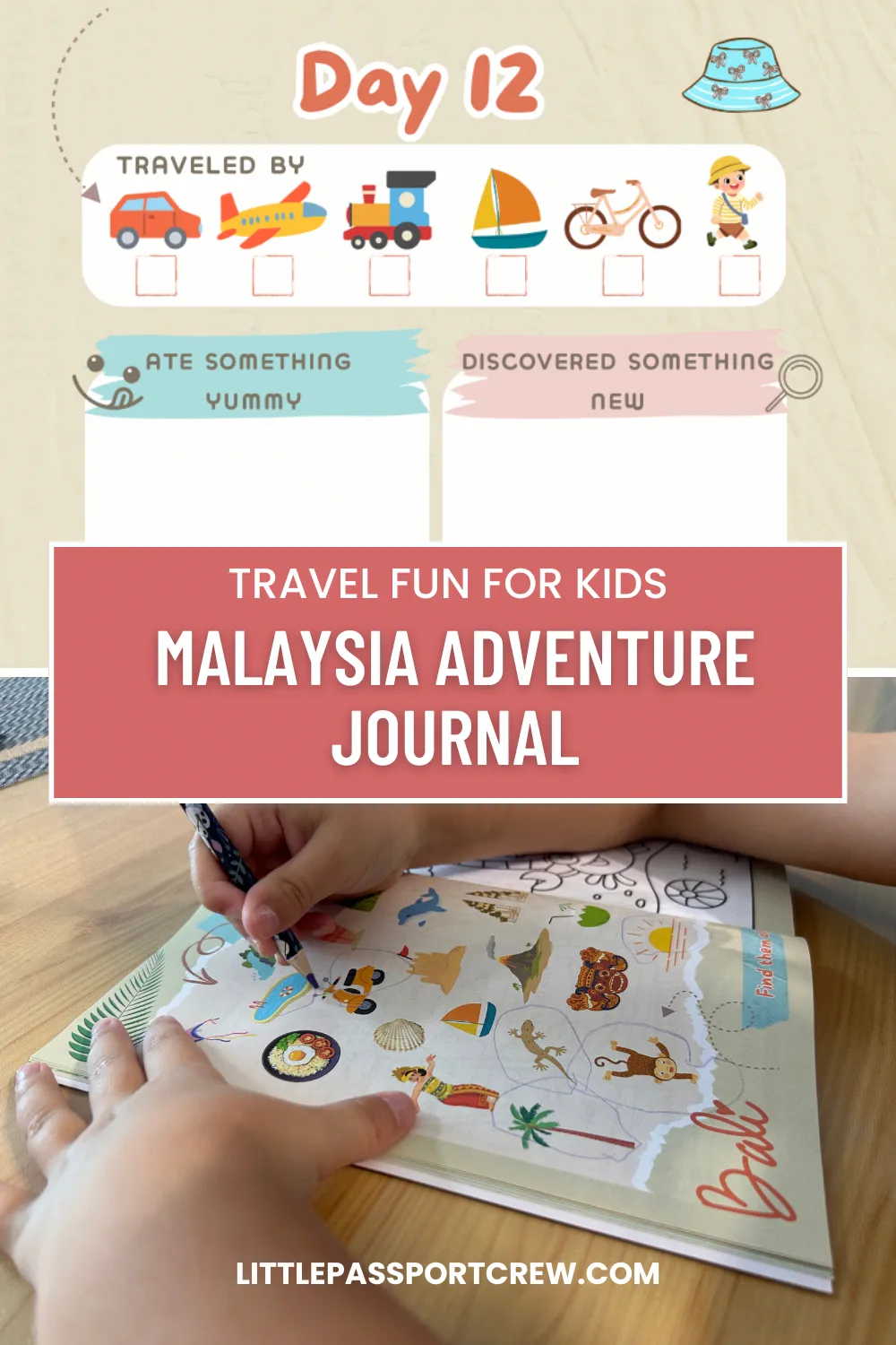 A printable kids travel journal designed for family trips through Indonesia, including Bali and Lombok, and Malaysia.