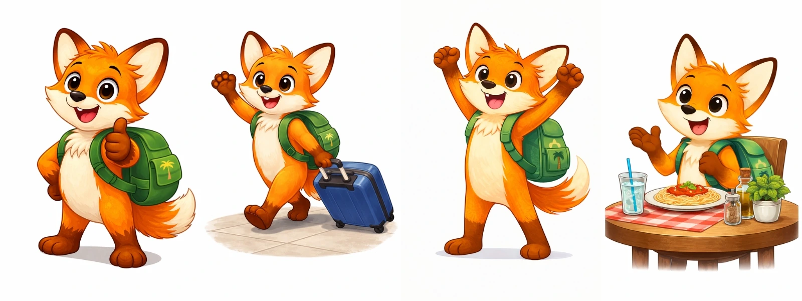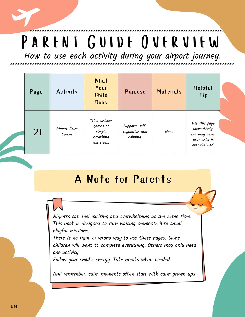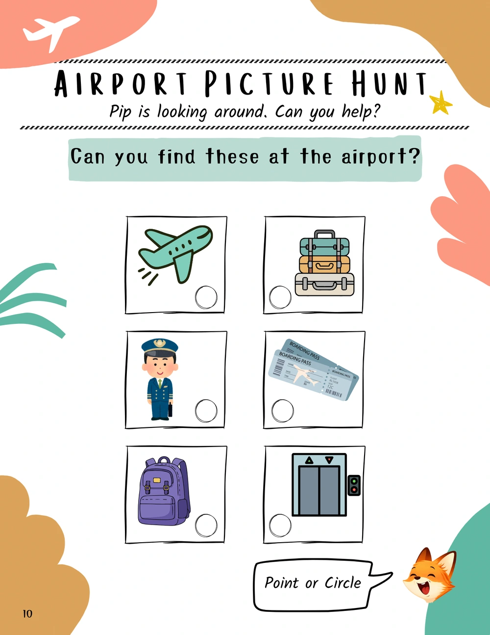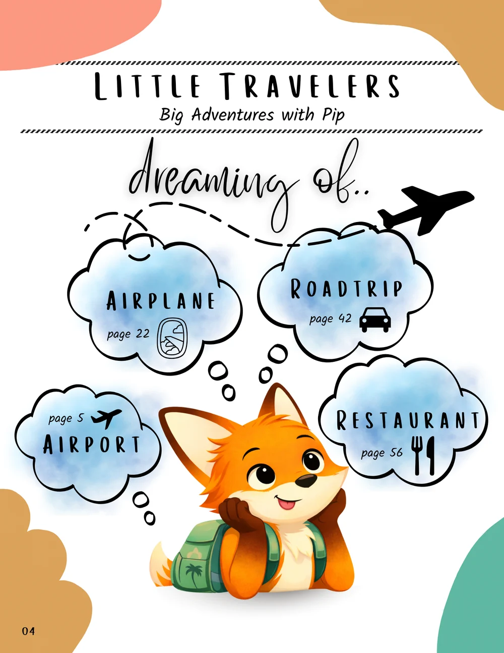 Throughout the activity book, Pip guides children during airports, flights, road trips and restaurant moments.
