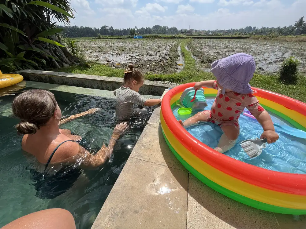 Ubud was a nice change after our visit to the beaches in the South and Nusa Lembongan. We stayed just outside the center in a villa with a pool and a view of the rice field (which was actually just a big muddy field 😅). They say Ubud is the cultural heart of Bali, and we get why. It’s a beautiful area with temples, rice terraces, waterfalls, and lots of cafés and restaurants with play areas or kids’ menus. The center can get a bit crazy with traffic, but there’s plenty to do and everything you might need when traveling Bali with kids.